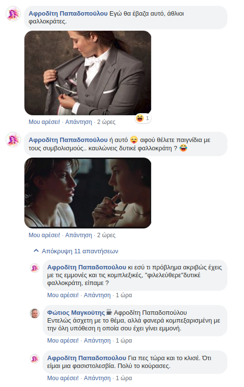 Για τον νεοέλληνα μαλάκα το να ποστάρει και να προβάλει μια λεσβία τις γκόμενές της και τη χαρά της ζωής, κυρίως το να λέει την άποψή της, είναι κομπλεξισμός. Είσαι ιατρική περίπτωση για τον κάθε ξεφτίλα φαλλοκράτη, για το ψυχιατρείο, επειδή δεν κουμπώνεις με τις κανονικότητες και τα στερεότυπα του κάθε πατριάρχη παπάρα. Ενώ το να ποστάρει αυτός ξέκωλα, με τη γλώσσα του να γλείφει το πάτωμα, είναι απλώς Δευτέρα, η super πραγματικότητα. Αυτός είναι ο άντρας που γαμάει και δέρνει. Ο ελληναράς μαλάκας που θα μας σώσει από την επέλαση του ισλάμ.